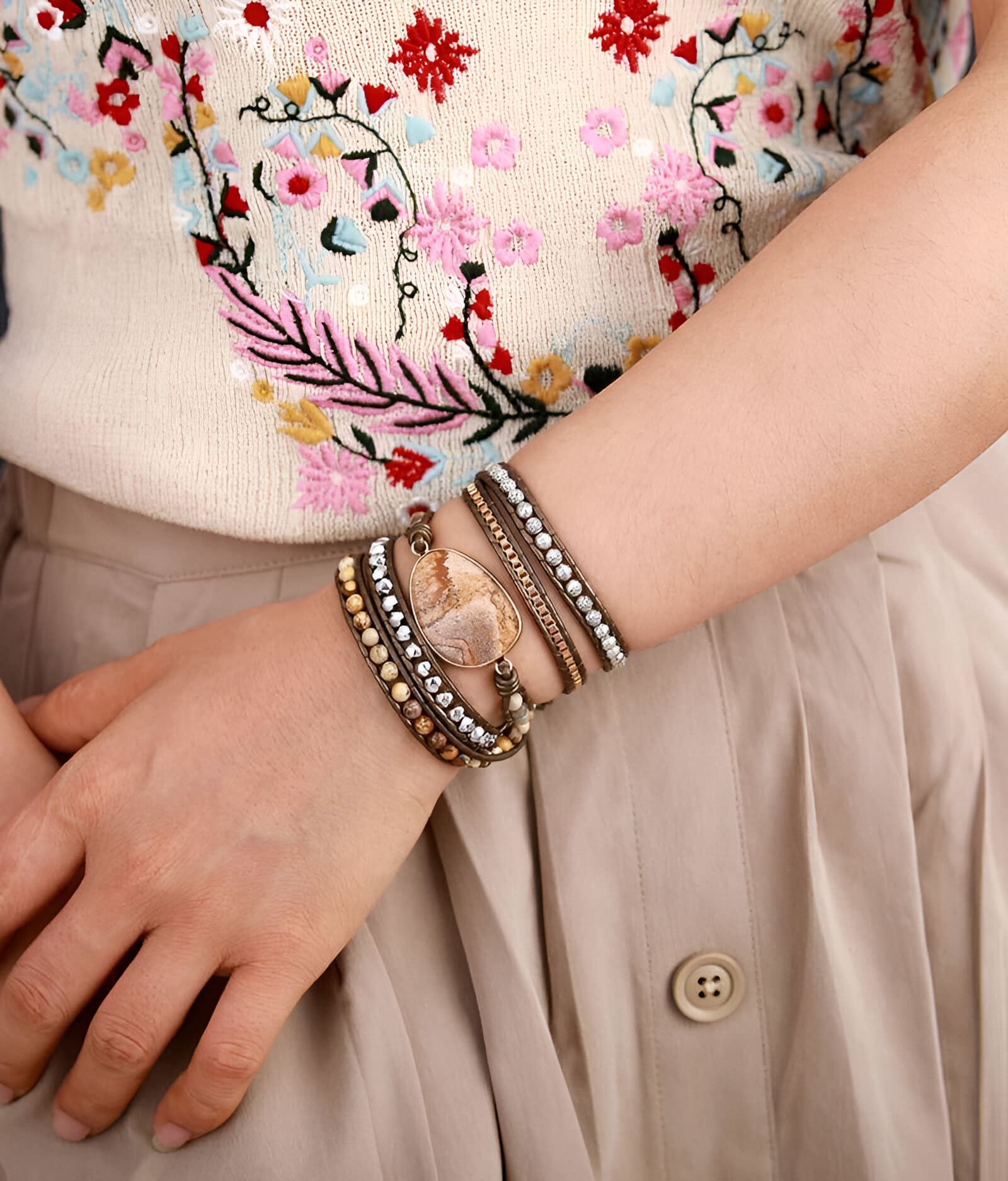 Dieses Armband wurde inspiriert von der tiefen Heilkraft der Erde. Die verwendeten Natursteine wie Jaspis, Quarz und Klarer Kristall helfen dabei, Blockaden zu lösen und den Energiefluss in Ihrem Körpersystem wiederherzustellen.